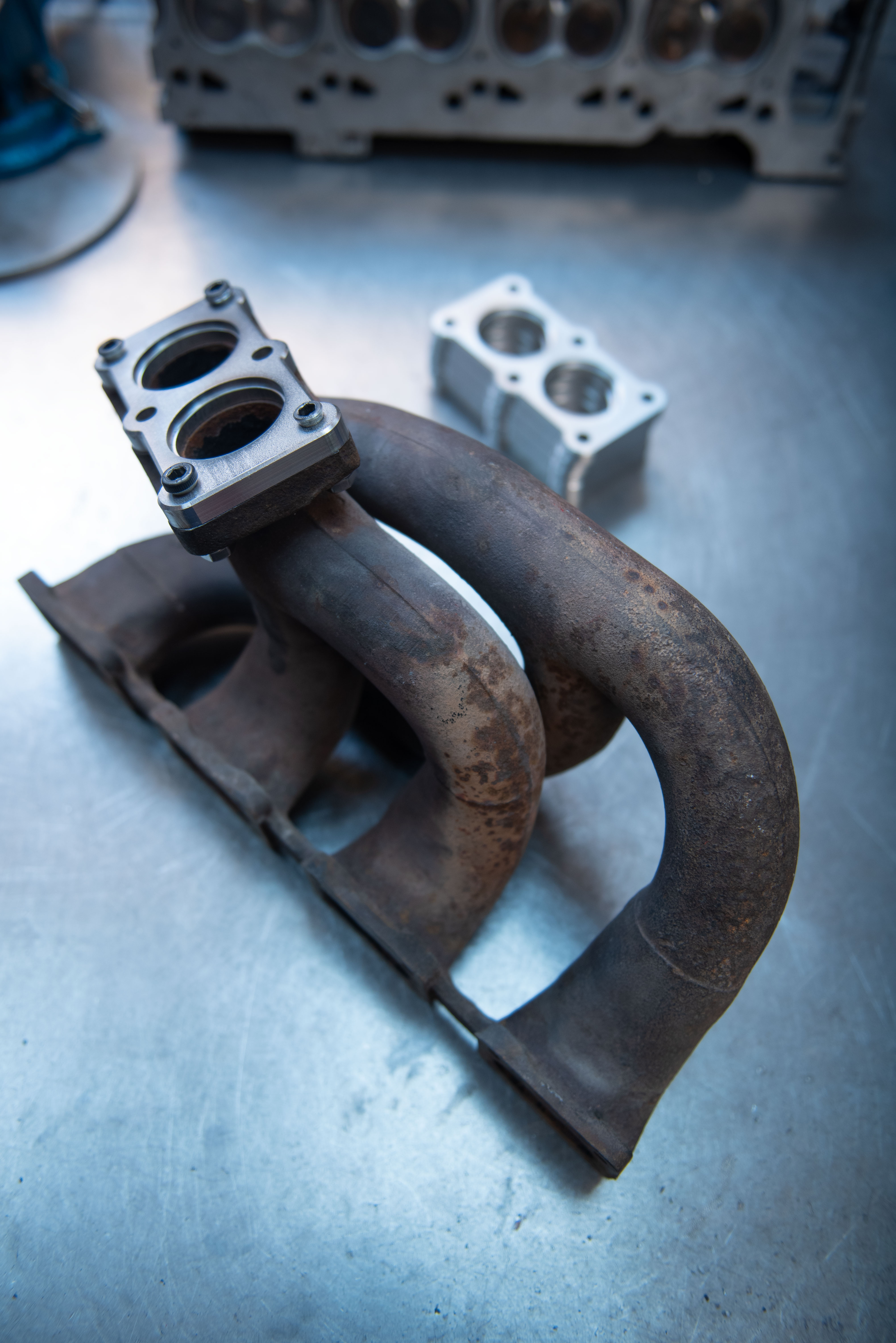 Aufwendig gefertigtes Hosenrohr aus Edelstahl 1.4301 für den Opel Ascona / Manta 400 mit originalem Gusskrümmer